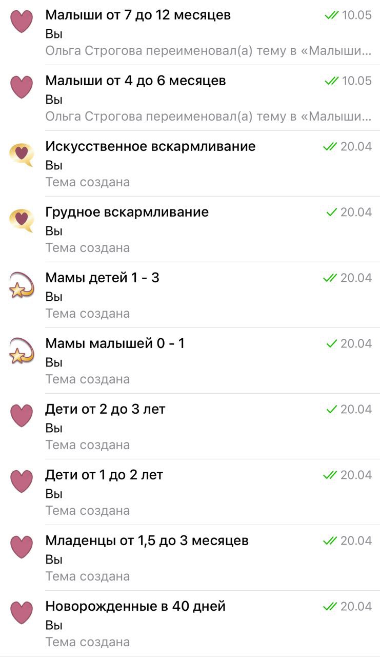 Кроме общего чата и чата по возрастам детей также есть чат с педиатром, чат по прикорму, чат по послеродовому восстановлению и многие другие